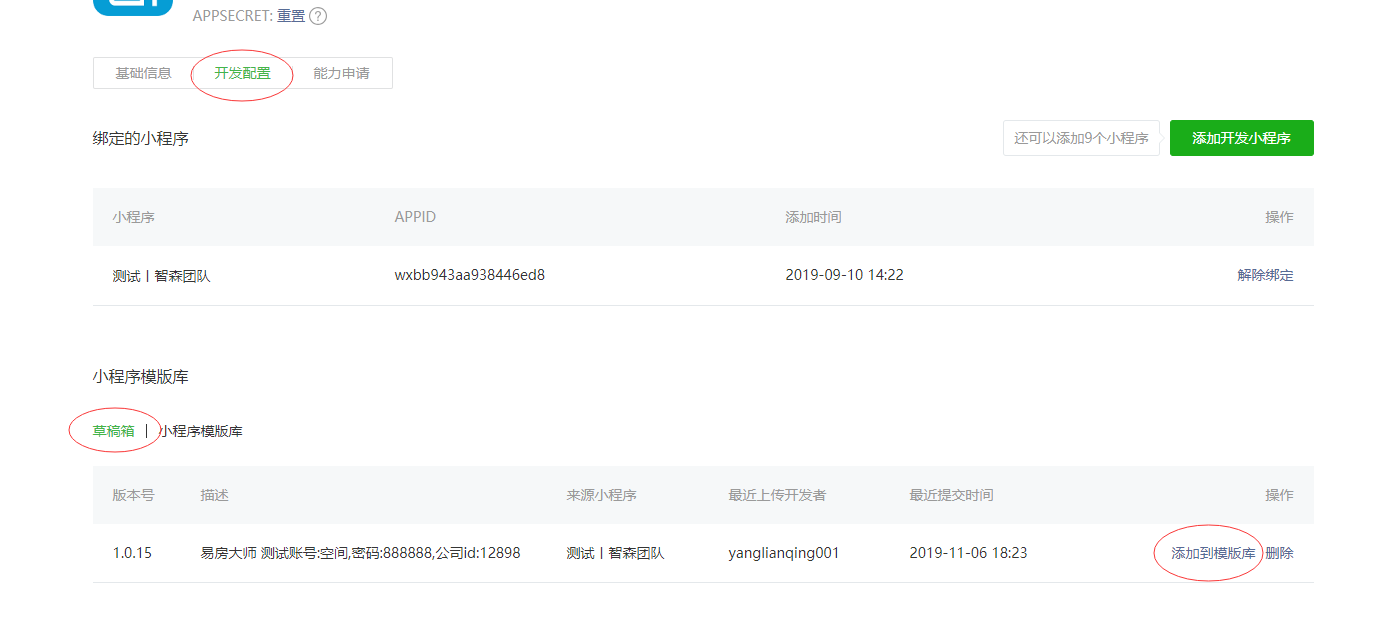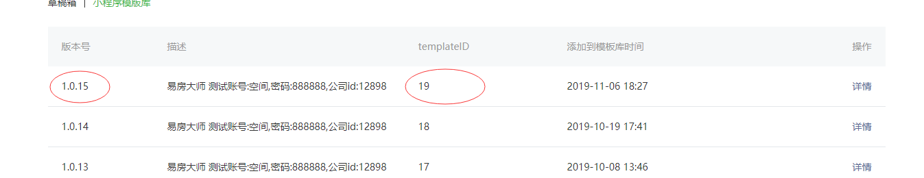 将提交到草稿箱的小程序添加到模板库后,在后台更新最新的模板id和版本号信息。